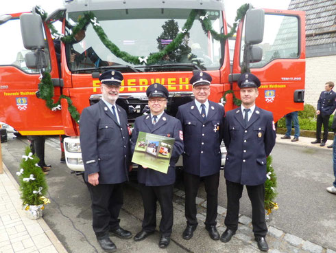 Im Rahmen der Fahrzeugweihe haben die Kameraden der Feuerwehr Trübenbach ein Erinnerungsgeschenk an den Kommandanten der Feuerwehr Weidhausen Günter Schlund überreicht.