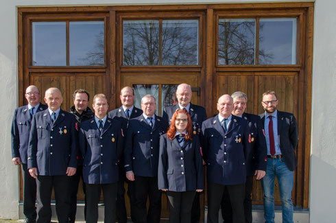 v.l. Siegfried Wendel, Ulrich Brehm, Michael Rühr, Stefan Suffa, Marco Bischoff, Helmut Krauß, Sabrina Freyer, KBM Jochen Mann, Kdt. Helmut Geßlein, Hans-Georg Frank, Bgm. Markus Mönch